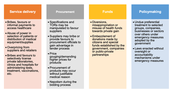 Crisis such as the COVID-19 pandemic further exacerbate the risk of corruption, particularly when country systems are fragile and there are limited or no effective oversight, audit and accountability mechanisms. In particular, conditions such as flexibility in responses, the simplification of procurement controls, the rapid flow of large funds, and the need for urgent responses instigated by the crisis create increased opportunities for corruption and fraud in the health sector.